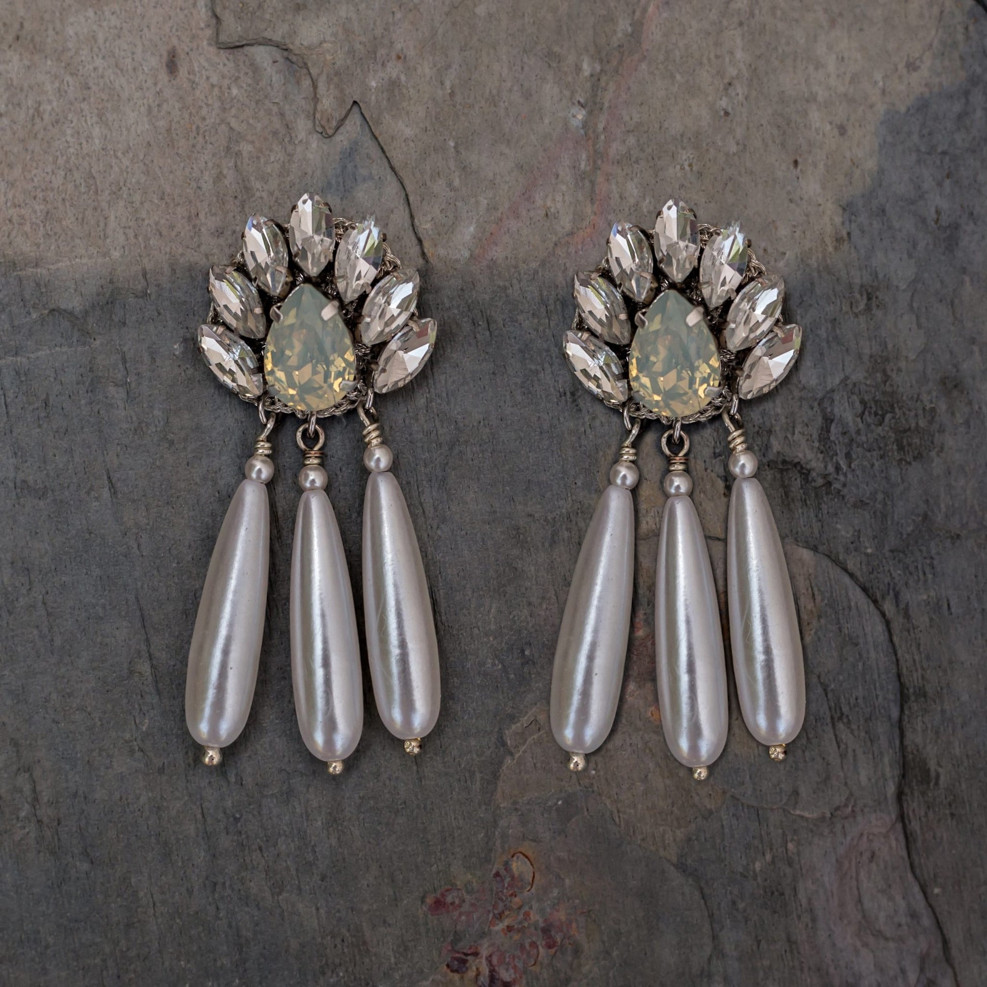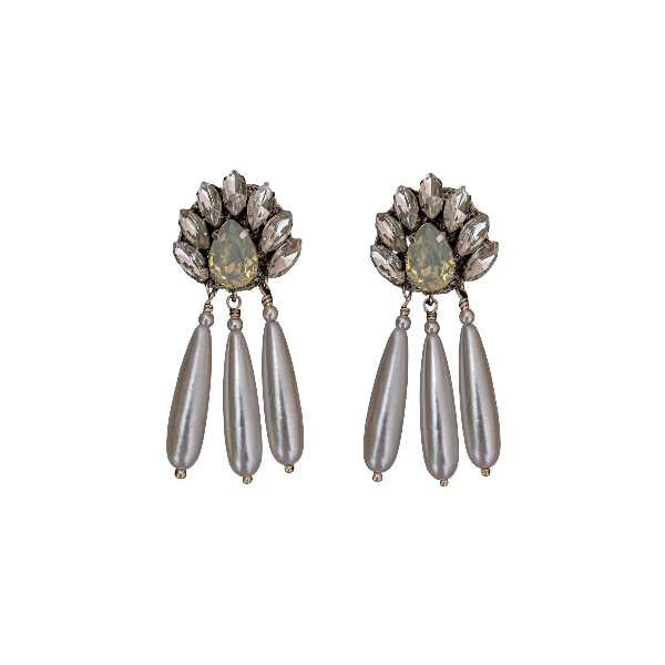 The Anne Drop Earring showcases a dazzling crystal stone cluster button, elegantly complemented by three elongated pearl-shaped drops. This refined design offers a graceful silhouette, perfect for adding a touch of sophistication to your look. Ideal for formal events or elevating everyday style with timeless elegance.