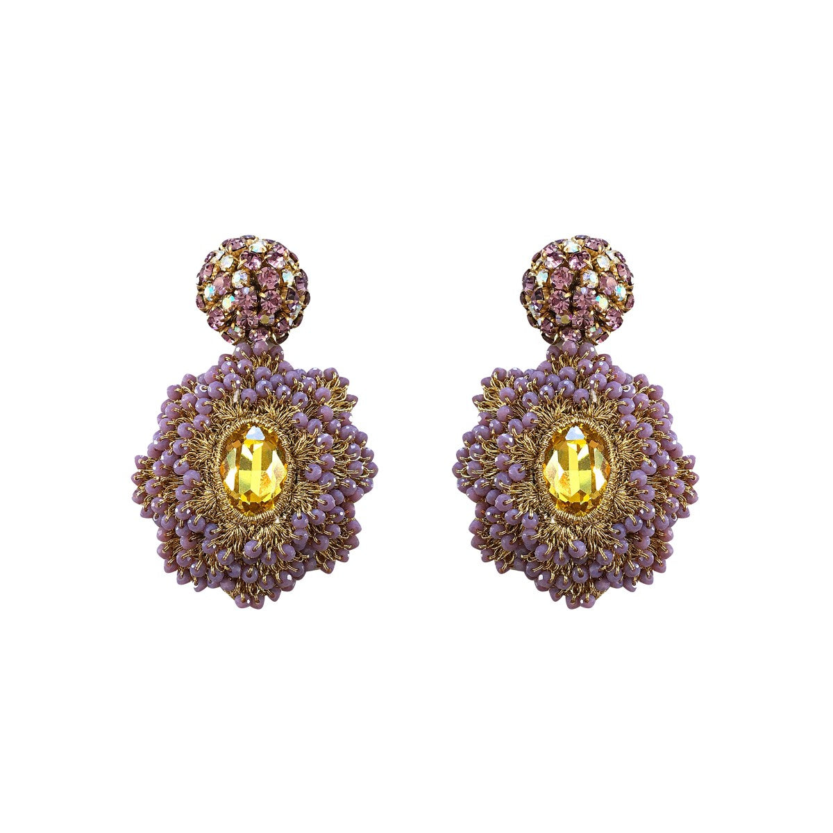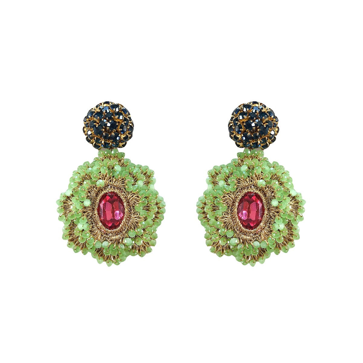 Architecturally sophisticated statement drop earrings featuring a select fancy stone encased within an intricate crystal bead crochet framework. The meticulous handwork creates a dimensional edge that accentuates the central stone, while the rhinestone-embellished button top provides a secure foundation with additional luminosity. The technical precision of the crochet technique ensures exceptional durability while maintaining the delicate aesthetic that defines fine jewelry craftsmanship.